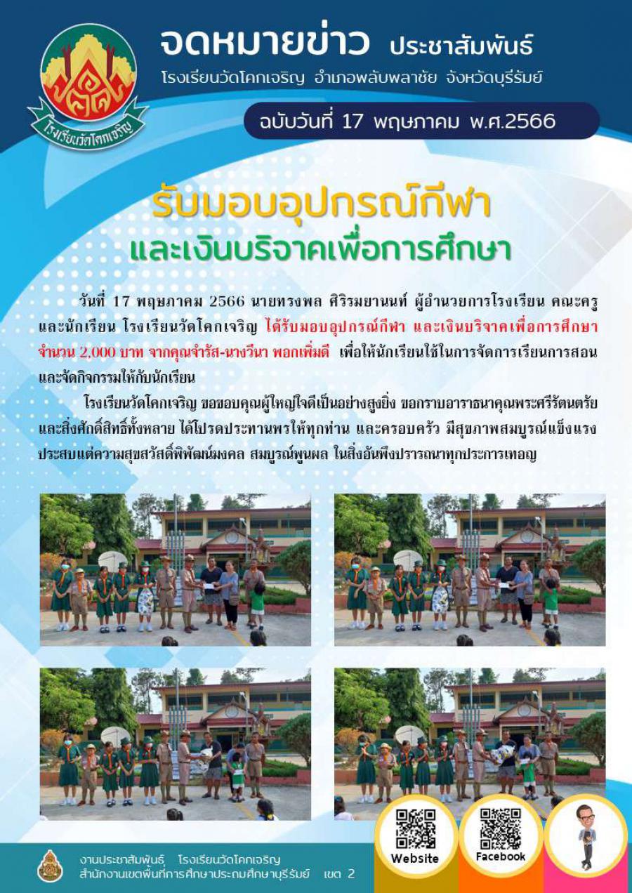 ได้รับมอบอุปกรณ์กีฬา และเงินบริจาคเพื่อการศึกษา จำนวน 2,000 บาท จากคุณจำรัส-นางวีนา พอกเพิ่มดี