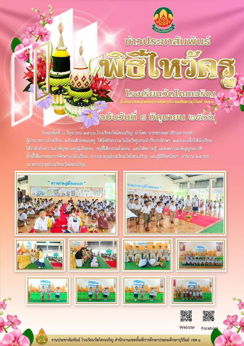 กิจกรรมวันไหว้ครูประจำปีการศึกษา ๒๕๖๖ และได้มอบทุนการศึกษาแก่นักเรียน จากกองบุญโรงเรียนวัดโคกเจริญ และผู้มีจิตศรัทธา จำนวน ๒๔ ทุน ณ หอประชุมโรงเรียนวัดโคกเจริญ