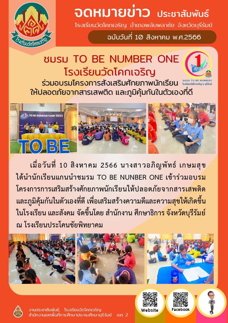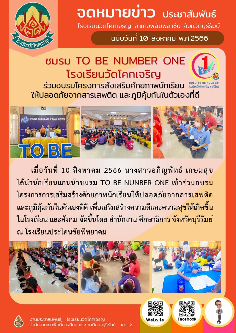 ชมรม TO BE NUMBER ONE โรงเรียนวัดโคกเจริญ ร่วมอบรมโครงการสังเสริมศักยภาพนักเรียน ให้ปลอดภัยจากสารเสพติด และภูมิคุ้มกันในตัวเองที่ดี
