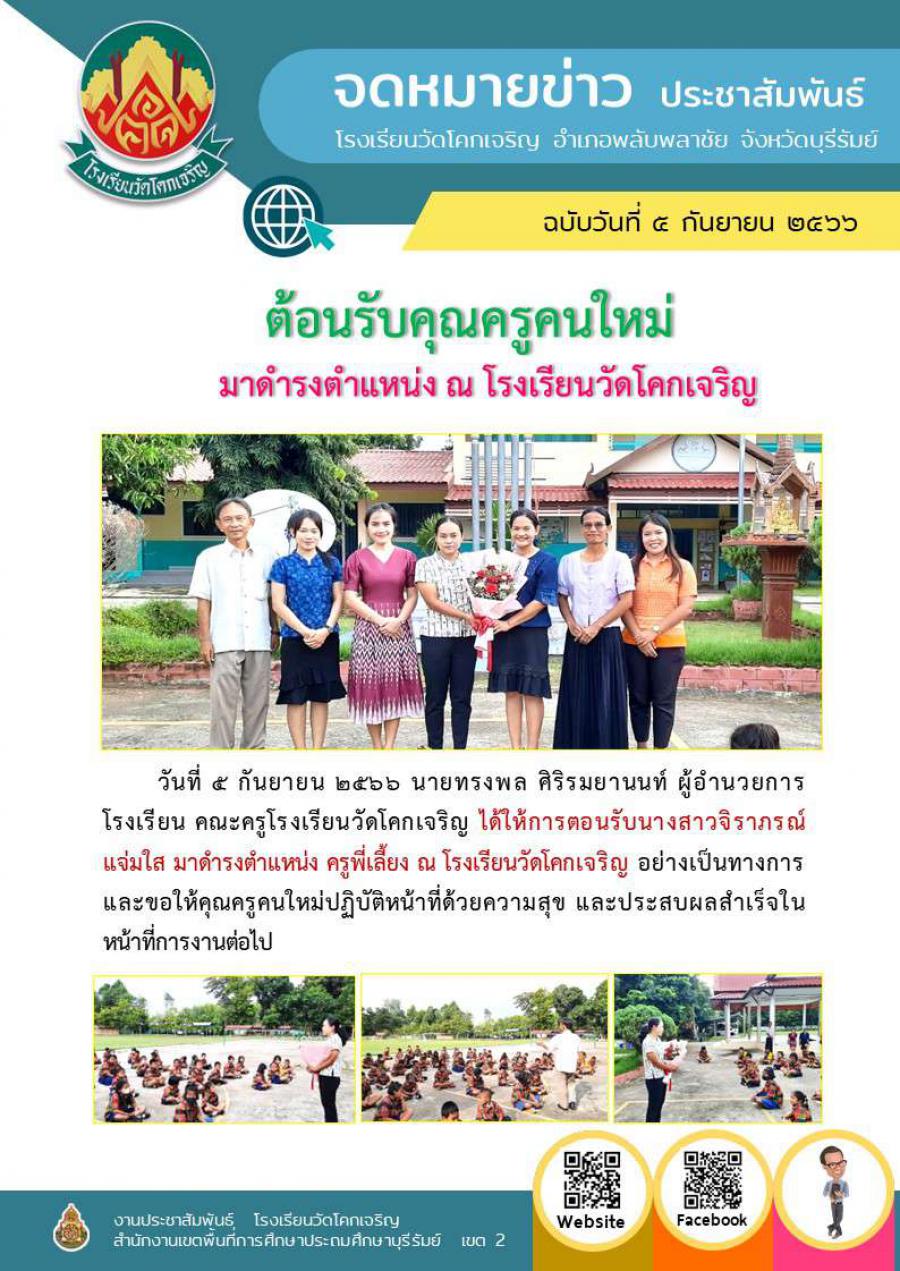 ต้อนรับนางสาวจิราภรณ์ แจ่มใส มาดำรงตำแหน่ง ครูพี่เลี้ยง ณ โรงเรียนวัดโคกเจริญ