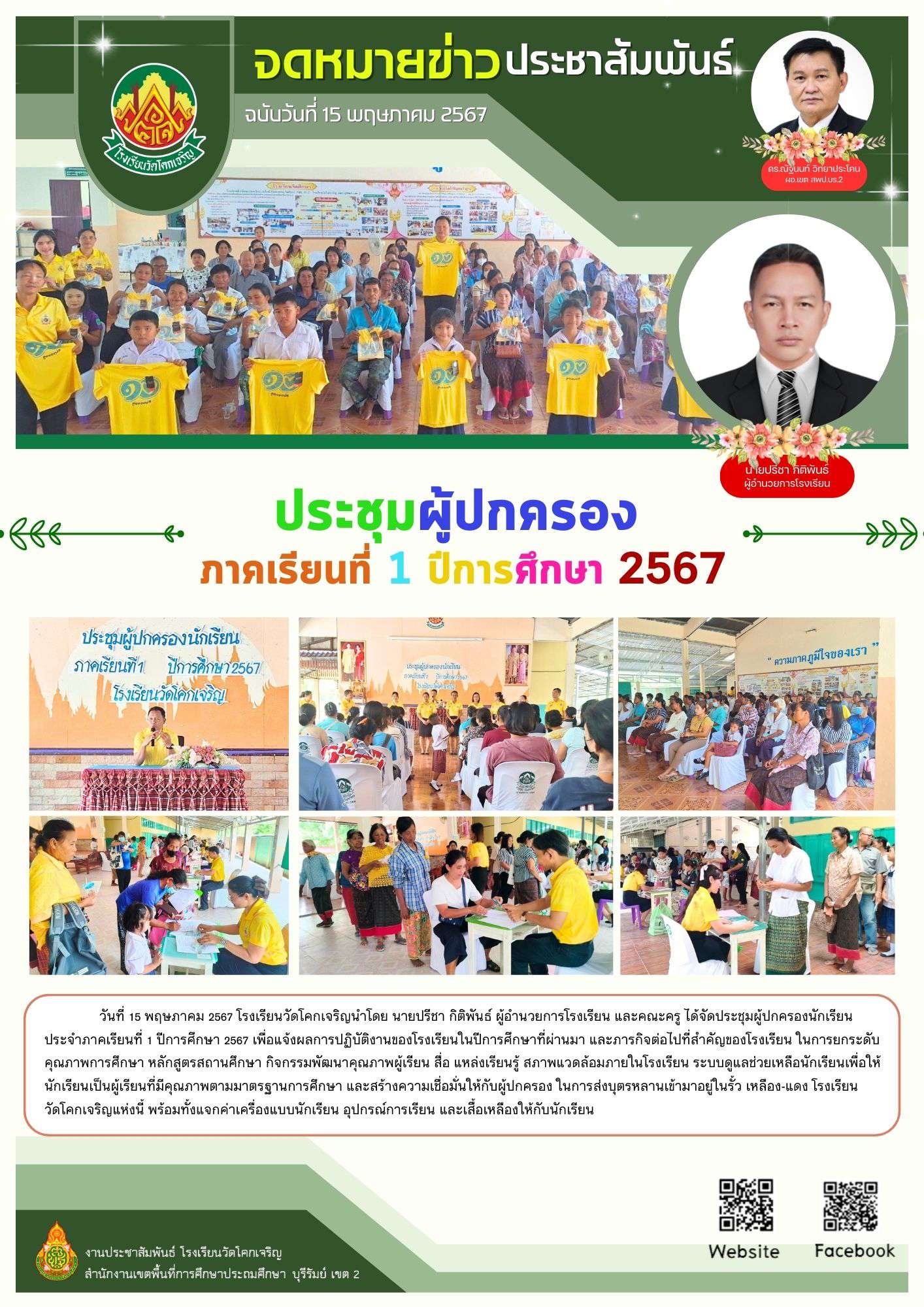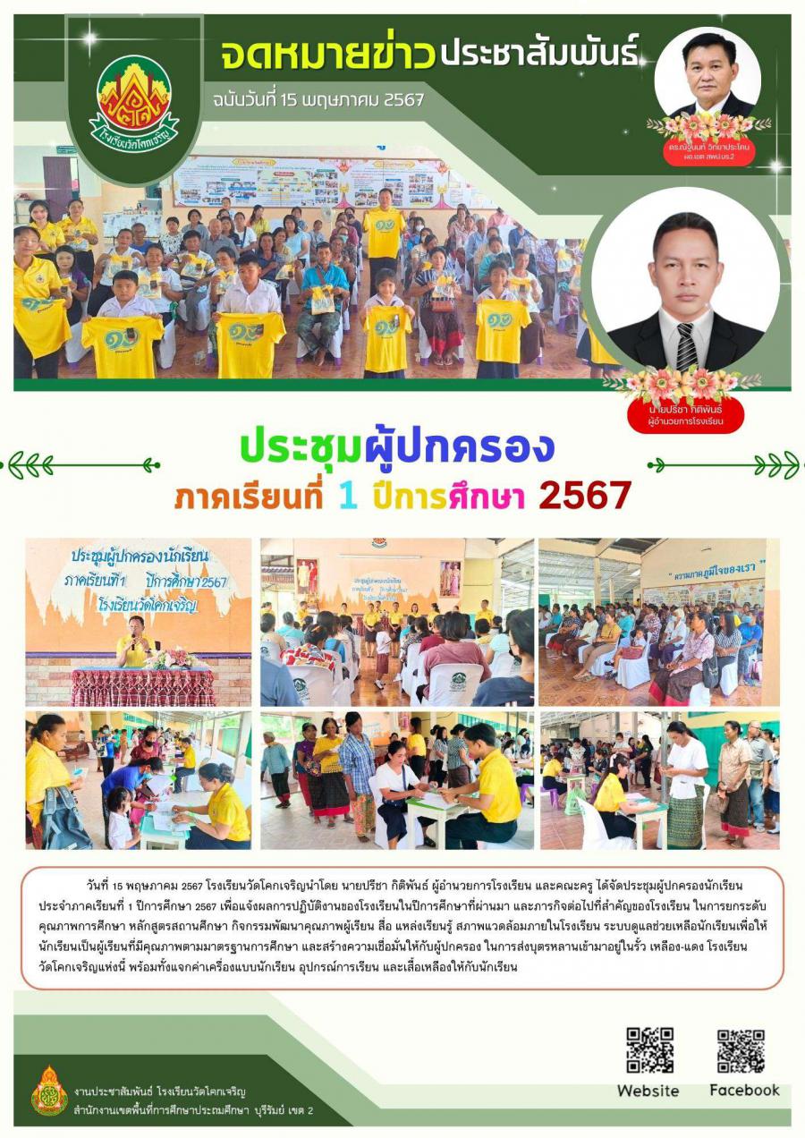 วันที่ 15 พฤษภาคม 2567 โรงเรียนวัดโคกเจริญนำโดย นายปรีชา กิติพันธ์ ผู้อำนวยการโรงเรียน และคณะครู ได้จัดประชุมผู้ปกครองนักเรียน ประจำภาคเรียนที่ 1 ปีการศึกษา 2567 เพื่อแจ้งผลการปฏิบัติงานของโรงเรียนในปีการศึกษาที่ผ่านมา และภารกิจต่อไปที่สำคัญของโรงเรียน ในการยกระดับคุณภาพการศึกษา หลักสูตรสถานศึกษา กิจกรรมพัฒนาคุณภาพผู้เรียน สื่อ แหล่งเรียนรู้ สภาพแวดล้อมภายในโรงเรียน ระบบดูแลช่วยเหลือนักเรียนเพื่อให้นักเรียนเป็นผู้เรียนที่มีคุณภาพตามมาตรฐานการศึกษา และสร้างความเชื่อมั่นให้กับผู้ปกครอง ในการส่งบุตรหลานเข้ามาอยู่ในรั้ว เหลือง-แดง โรงเรียนวัดโคกเจริญแห่งนี้ พร้อมทั้งแจกค่าเครื่องแบบนักเรียน อุปกรณ์การเรียน และเสื้อเหลืองให้กับนักเรียน